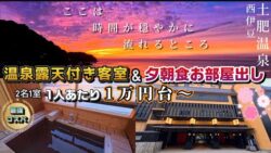 温泉 【西伊豆 土肥温泉 静岡県】超コスパの極上宿!温泉露天付き客室&夕朝食お部屋出し!客室温泉露天風呂から見るサンセットに感動!お部屋食で極上海鮮料理!それでも1人あたり1万円台!|たたみの宿 湯の花亭